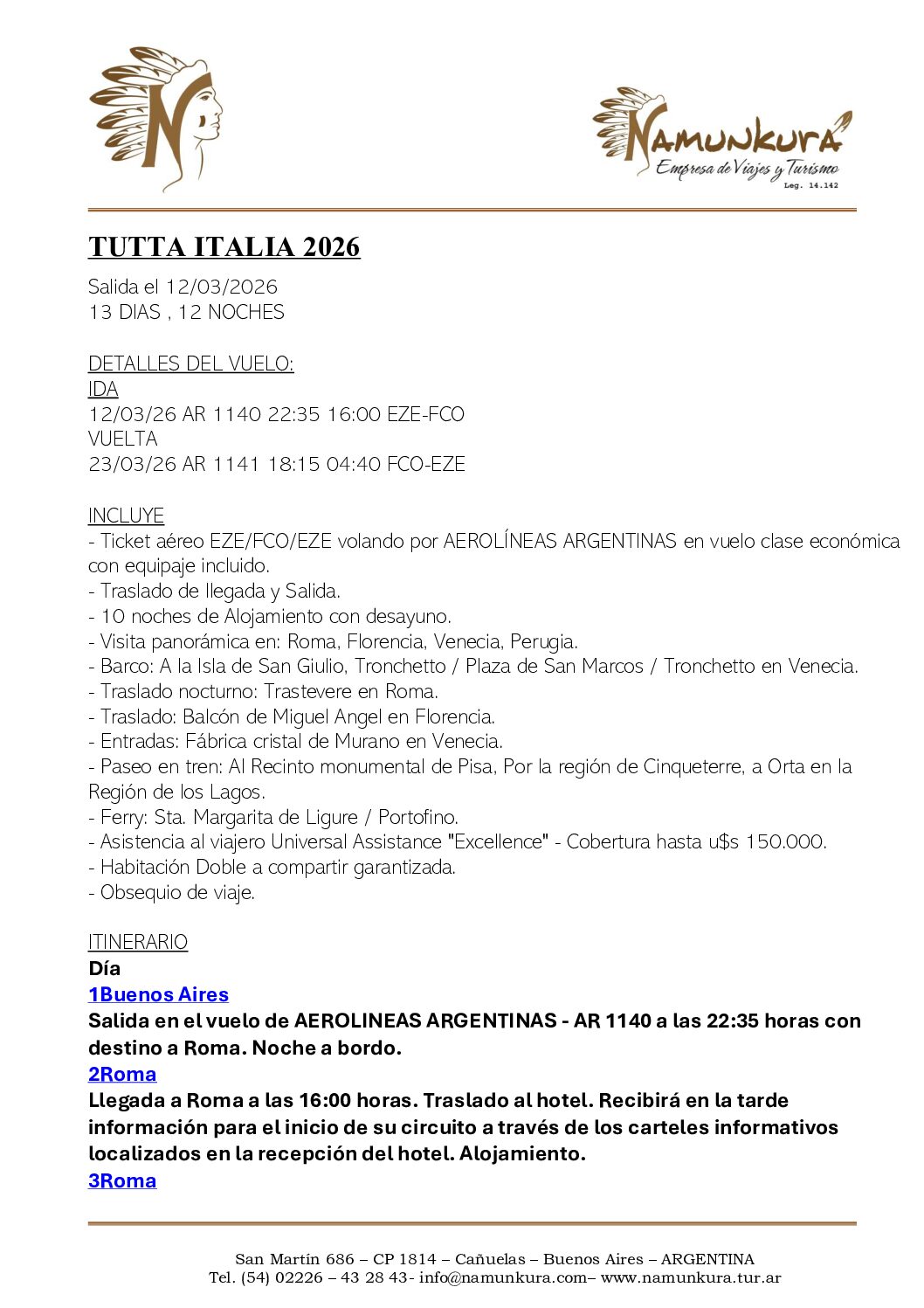 • Ticket aéreo EZE/FCO/EZE volando por AEROLÍNEAS ARGENTINAS en vuelo clase económica con equipaje incluido.